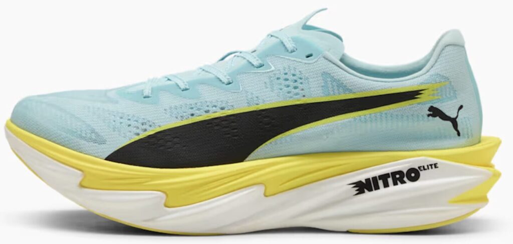 PUMAが誇るレーシング厚底シリーズの最新モデル、「ディヴィエイト ニトロ エリート 4」。高い反発性と推進力を追求した一足で、スピード重視のレースやタイム狙いのトレーニングに最適です。