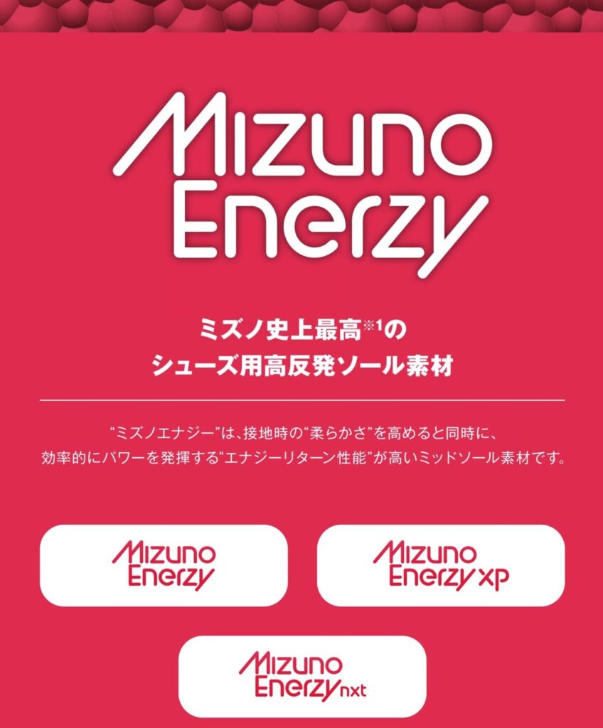 『ミズノエナジー(MIZUNO ENERZY)』は、ミズノが独自に開発した高反発・高クッション性のミッドソール素材です。